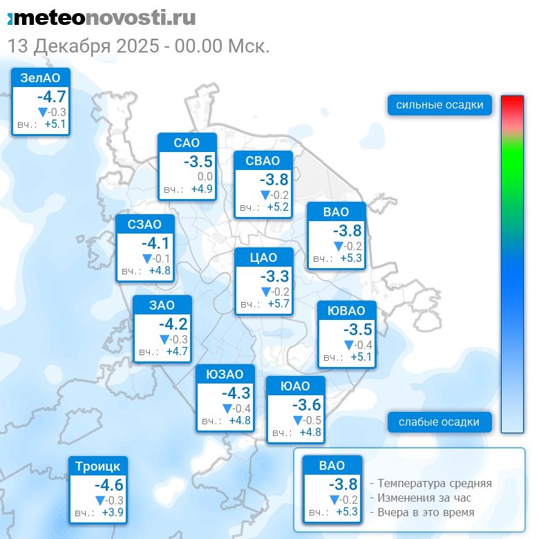 В 0:00 в Москве было от -5°C до -2.9°C, средняя температура -3.9°C #погода #Москва #зима #температура #13декабря #суббота