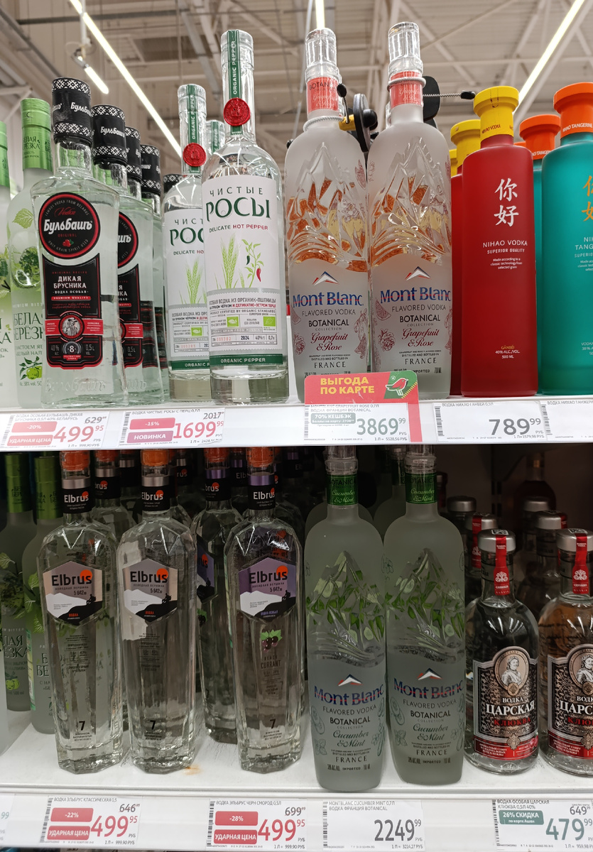 Что за странное сочетание, можете удивиться вы. Да, грейпфрут и роза, «лед и пламень», как говорил великий русский поэт совсем по другому случаю. Есть ещё более экстравагантная комбинация вкусов у водки Mont Blanc - Cucumber & Mint, то есть "Огурец и мята". Ее я тестировал в прошлом году, ссылка на обзор - в конце этой статьи. Вот на полках «Ашана» оба упомянутых вида французской водки в таре 0,7 литра среди отечественных: