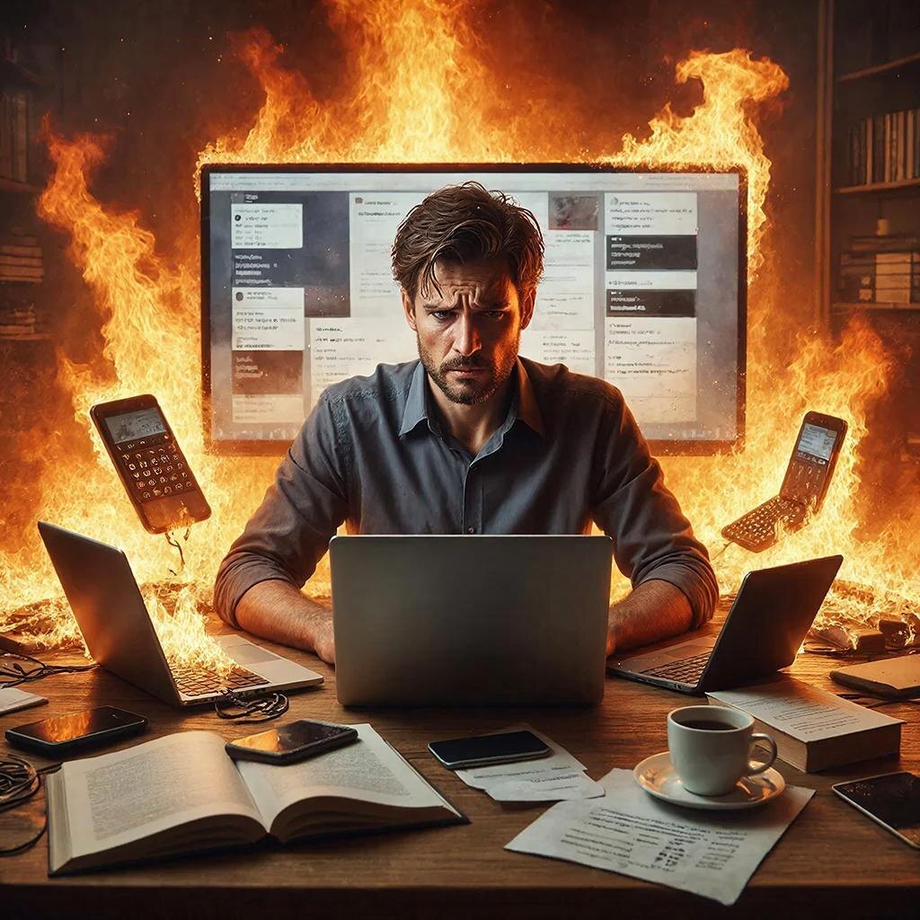 Зачастую же бывает так, что бизнесмен наворотил столько всего в делах, что они горят ярким пламенем. Как ужаленный в одно место он бегает и ничего не успевает, "тушит пожары", имеет сотню рабочих чатов, которые не читает. Пытается "сохранить лицо".