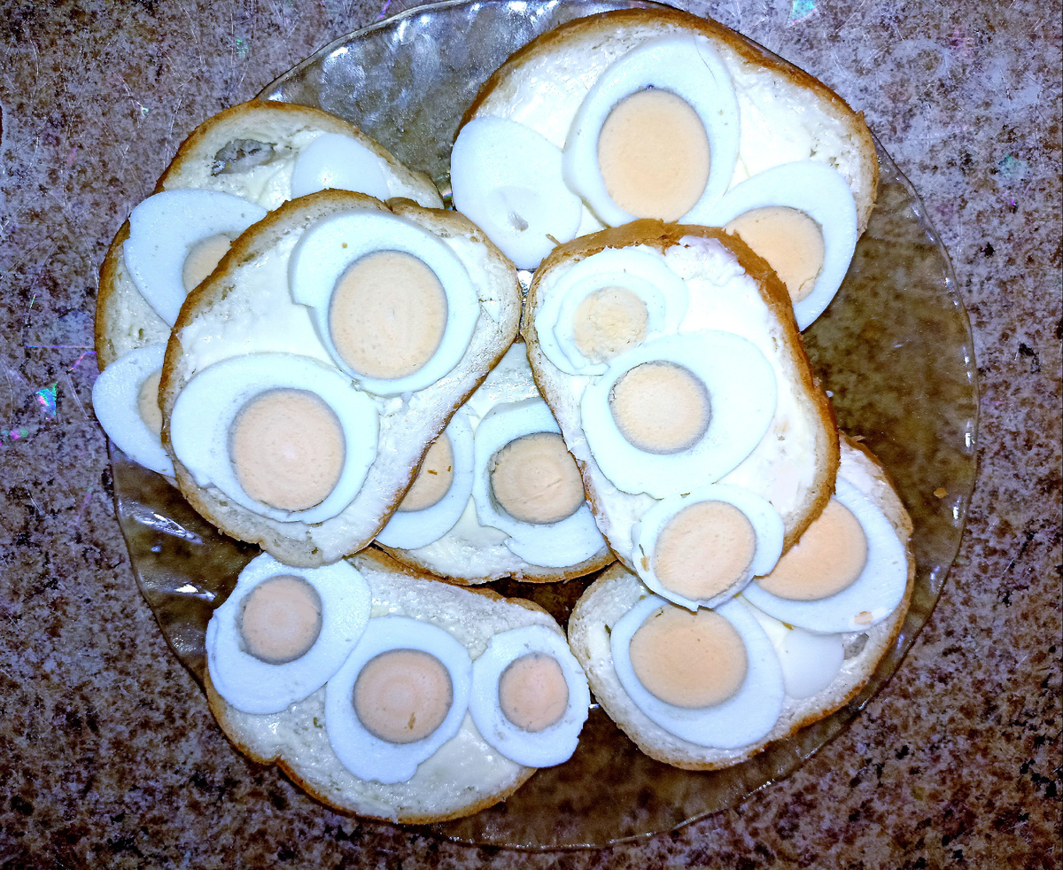 Начало здесь:👇🏼 Сегодня за продуктами я не ходила, нам вполне хватило того, что есть в наличии дома. Коты опять разбудили ни свет ни заря, и не дали поспать, и к тому времени, когда я обычно встаю, мне уже изрядно захотелось поесть. В качестве завтрака я сделала бутерброды с варёными яйцами, которые остались от вчерашней "Селёдки под шубой".👇🏼 Несмотря на то, что по составу эти бутерброды невозможно просты, весьма удачное вкусовое сочетание батона, сливочного масла и варёных яиц делает их невероятно вкусными. Мы такие очень любим! 😋👍🏼 Моя сестра, однажды попробовав у нас в гостях эти бутербродики, сказала, что в жизни не ела ничего вкуснее, ведь всё гениальное, как известно - просто! 😂 Днём я варила гороховый суп с копченостями.👇🏼 Копчености я покупаю на развес. Те, которые продаются в вакуумных упаковках, я не люблю. Развесные гораздо вкуснее, да и мяса на них больше.👇🏼 Рёбрышки я сначала немного отвариваю, чтобы мясо легче отделялось от костей, т.к. класть его в су