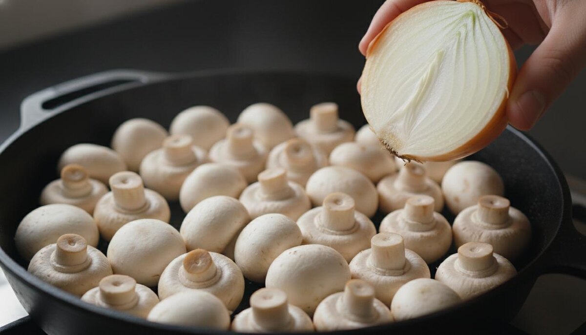 Обычно жареные грибы — это просто грибы с луком. Вкусно, но скучно. Я нашел способ превратить обычные магазинные шампиньоны в блюдо ресторанного уровня. Секрет в сочетании двух видов масла и пикантной глазури, которая карамелизуется прямо на сковороде. Получается что-то в азиатском стиле: сладко-солено, ароматно и очень красиво. Отлично заходит и как гарнир, и как самостоятельная горячая закуска. Как я готовлю жареные шампиньоны в пикантном соусе: Начинаем с масляной основы. Ставлю чистую сковороду на огонь. Наливаю немного растительного масла и сразу добавляю к нему кусочек сливочного. Сливочное даст нежный вкус, а растительное не даст ему сгореть. Жду, пока смесь полностью разойдется. Беру 200 граммов шампиньонов. Нарезаю их пластинками или четвертинками (если грибы мелкие). Выкладываю на сковороду. Жарю на среднем огне 3–5 минут. Главная цель сейчас — получить уверенную золотистую корочку, поэтому не мешайте их каждую секунду. Когда грибы подрумянились, добавляю овощи. Нарезаю 1 гол
