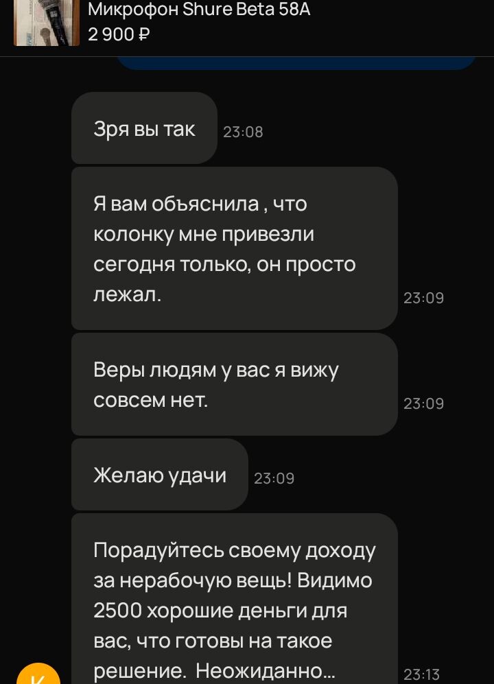 Уважаемые подписчики , коллеги , авитологи и просто хорошие люди, прошу Вас высказать, поделиться своим мнением... Очень сильно переживаю ... Недавно я рассказывала о своих продажах и об одной из них я расскажу историю: девушка купила у меня микрофон хорошей фирмы,в рабочем состоянии, по крайней мере мы его проверяли и он был рабочий.Это было 2 недели назад .Всё было хорошо, НО сегодня она мне написала, что микрофон в итоге не рабочий, как бы нам решить эту проблему? Я ей ответила, что наверное подключали не внимательно, поэтому не работает, у меня была похожая история один раз, когда мужчина купил колонки(подключил неправильно , и тоже мне написал,что они не работают, но в итоге всё хорошо разрешилось, поскольку он ещё раз попробовал и всё заработало ), а девушка настаивает, что уже пробовала 100 раз подключать, и не работает. Я ей написала , что не знаю как решить эту проблему, поскольку микрофон точно рабочий(проверяли!) да и 2 недели прошло, может быть она им просто попользовалась