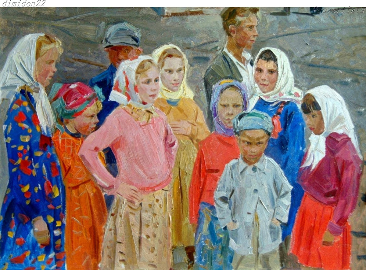 Самсонов Евгений Иванович (08.12.1926, Иркутск - 23.06.2018, Москва). «Мордовские дети». 1963 год. Картон, масло, темпера; 50 х 69 см.; (Музей изобразительных искусств Комсомольска-на-Амуре Хабаровского края).