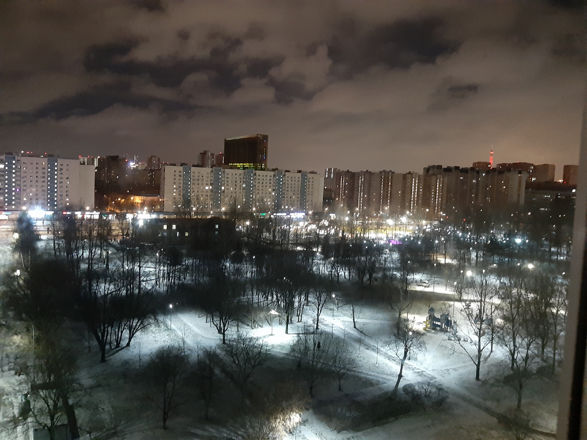 По моему разумению никогда. Все время какая-то движуха.Время 1.10 ночи, 13 декабря. Легла спать, выключила свет, а тут такие облака на небе, да еще и с такой большой скоростью летят. А это Останкинская телебашня, похолодало на улице, -3, и сразу стало ясно, башня хорошо видна. Теперь она белая Ну и синяя.Башню подсвечивают в цвета Российского флага ночью. Снегом припорошило парк. А это магазины И ужас нашего городка.Новостройка Дом Малевич. У нас его не иначе как Черный квадрат называют, весь вид из окна испортил. А вчера я гуляла в парке, оказывается там посадили розы, большая круглая клумба. Сиротинки зимуют в открытом виде, их подрезали, листья не ободрали, прививку засыпали землей. Грустная картина. Ну и какой тут сон, когда вокруг такая иллюминация? Что удивило.В этом году ни одного украшения к новому году, даже елку в парке не поставили. А ведь каждый год ставили и в парке всегда концерты в праздники, там сцена стоит. Тишина. Рядом большой торговый центр, тоже укра