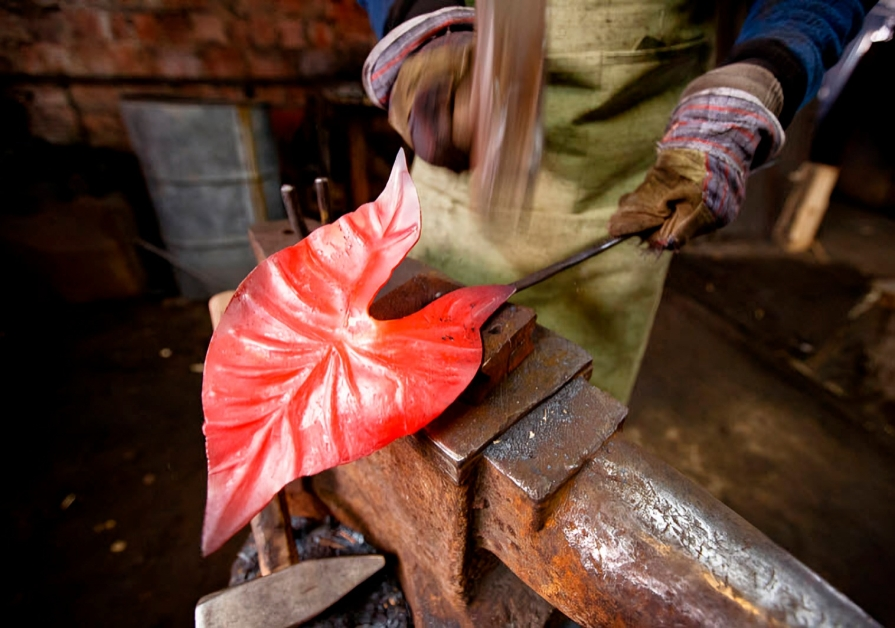 Процесс начинается с болванки — прутка или листа металла. Разогретый в горне до вишневого цвета металл становится податливым и готовым к обработке. На наковальне формируются основные элементы: осадка утолщает металл, вытяжка удлиняет, рубка разрезает, а волочение придает нужную форму. Рельефы создаются кувалдой или прессом: молотчатые текстуры имитируют листья, а гравировка добавляет тонкие узоры. Декоративные элементы — завитки, шипы, кольца — формируются вручную или с помощью шаблонов, иногда с вальцовкой для плавных изгибов.
