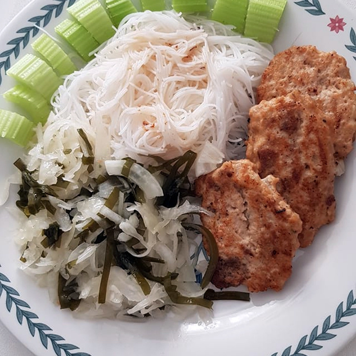 Лососевые котлетки с лапшой-фунчозой и салатом из квашеной и морской капусты