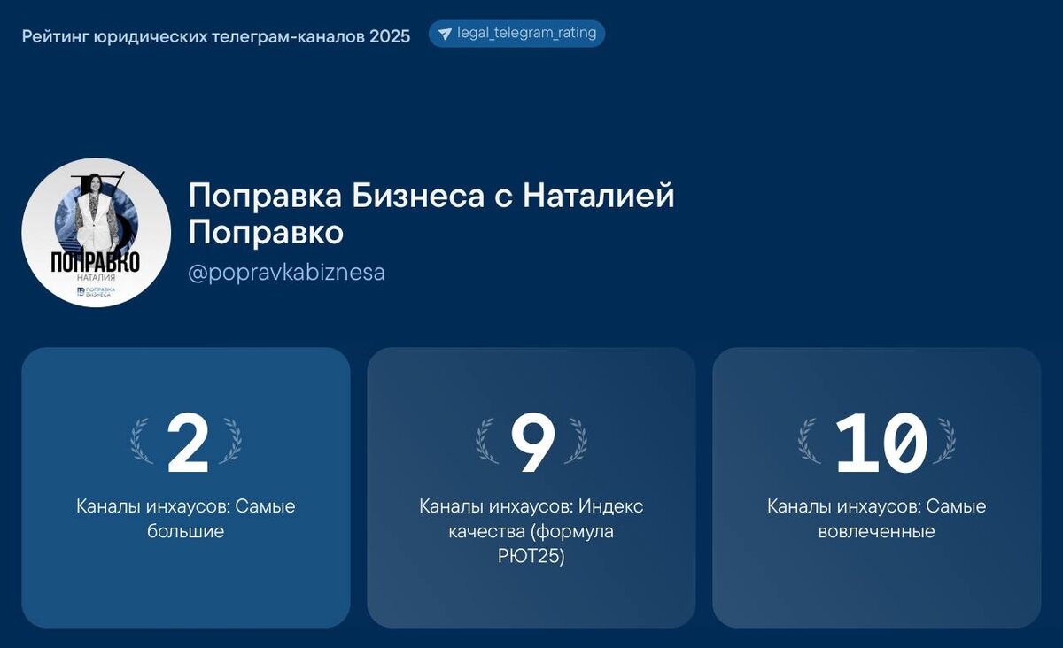 Не только радость, но и ответственность! Вчера я с удивлением увидела свой канал в рейтинге legal.telegram 2025: https://t.me/legal_telegram_rating/90 И первая мысль была не «ура, мы вторые!», а «теперь планка стала ещё выше». Быть в таком рейтинге — особенно на 2-м месте по подписчикам среди инхаусов — это не просто цифра в таблице. Это десятки глаз, которые каждый день открывают канал в ожидании чего-то ценного. Среди подписчиков канала высокие профессионалы, я знаю, что у Вас нет времени на пустые слова. И я чувствую огромную ответственность перед вами, и перед каждым, кто доверил мне своё время. Спасибо за это доверие. Оно — мой главный двигатель. Потому что ваше внимание заслуживает только лучшего контента. Это не финиш, а новый старт. С более высокой планкой. Прикрепляю карточку с результатами — это наша общая победа и мой новый уровень обязательств перед Вами. И благодарю организаторов рейтинга и экспертов, которые голосовали за канал!