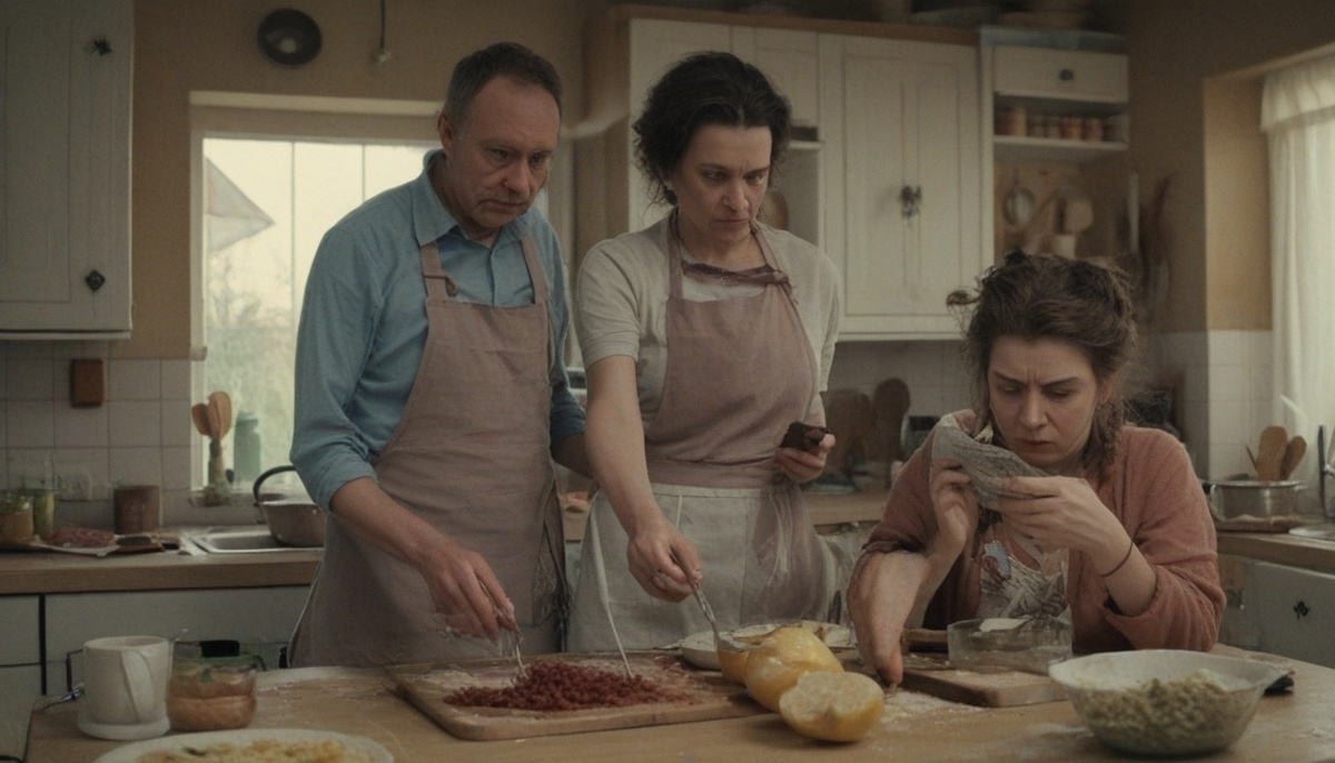 Алексей встречал гостей в фартуке и с поварёшкой в руке. Он был сосредоточен и немного взволнован. Вера стояла рядом с ним, скрестив руки на груди и наблюдая за происходящим с ироничной улыбкой.