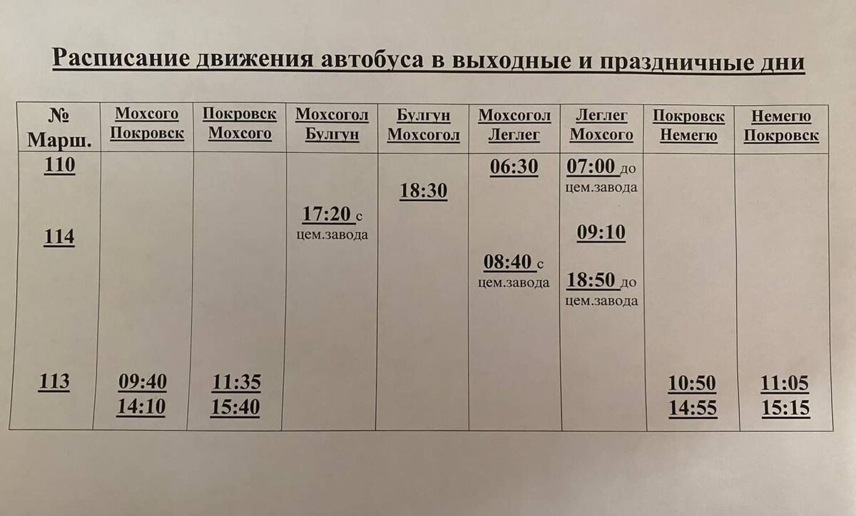 Сегодня 13.12 .25 маршруты 110/113/114 по техническим причинам будут ходить по выходному расписанию. По причине низкой температуры и плохой видимости на дороге маршрут 210 сегодня курсировать не будет. Рейс отменяется перевозчиком в целях обеспечения безопасности пассажиров. Для возврата онлайн билета обратитесь в автовокзал г.Якутск 8 (411) 235-53-55 «Атлант Авто»