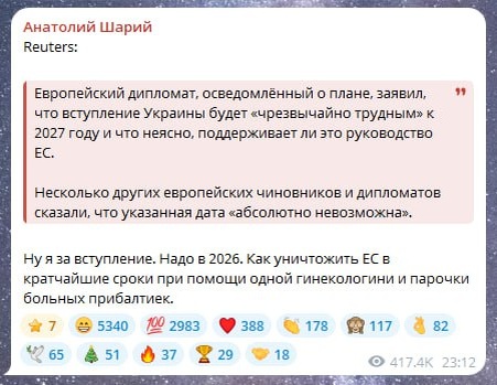 Во-первых, Анатоль, не парочки, а троечки, не обижай болонок. А во-вторых, етот самый ЕС они благополучно похерят и без вас, родимых. В смысле, с вами, конечно, но без официального участия. Вам достаточно будет рядом постоять. Должен сразу заявить со всей откровенностью, что вашей вины в том немного, как бы вы ни кичились (хотя вы будете). Изначально конструкция была нежизнеспособной, вон, наглосаксов спросите, они первыми чухнули и сдриснули. Думаю, скоро лягушатники на выход из курятника попрутся, а после и и в целом вся конструкция посыплется. 🐶 Подпишись на Шарика! Гав!