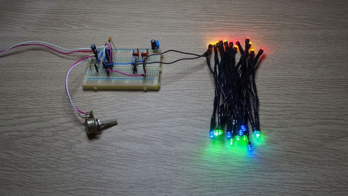 Схема предназначена для управления гирляндой, в которой светодиоды включены встречно-параллельно. Рисунок 1. Для управления такой гирляндой необходимо менять полярность подаваемого напряжения. Поэтому в схему добавлены два транзистора разной структуры. Когда на выводе 3 микросхемы сигнал низкого уровня, открыт транзистор Q1, поэтому на выводе гирлянды, который подключен к резистору R3, сигнал высокого уровня. При сигнале высокого уровня на выходе микросхемы открыт транзистор Q2 и на выводах гирлянды напряжение противоположной полярности. Если добавить в схему фоторезистор, его можно включить между резистором R2 и переменным резистором VR1, то скорость мигания гирлянды будет зависеть от освещенности. При уменьшении освещенности, скорость мигания будет уменьшаться.