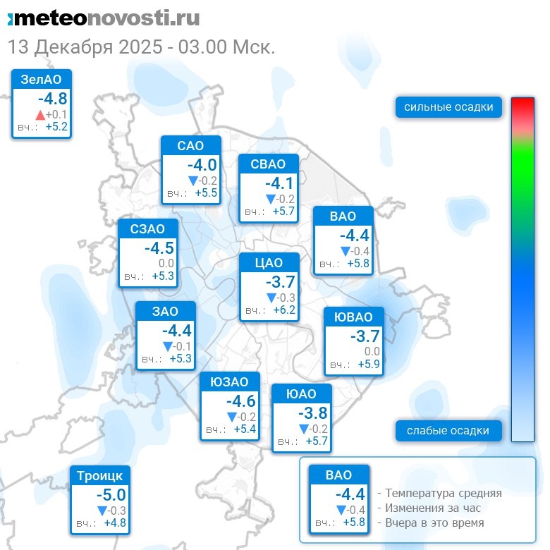 В 3:00 в Москве было от -5.2°C до -3.2°C, средняя температура -4.2°C #погода #Москва #зима #температура #13декабря #суббота