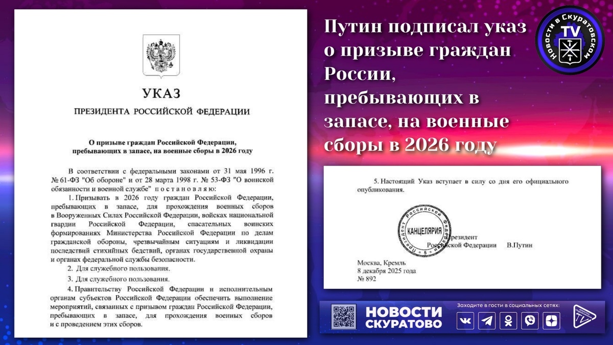 Путин подписал указ о призыве граждан России, пребывающих в запасе, на военные сборы в 2026 году