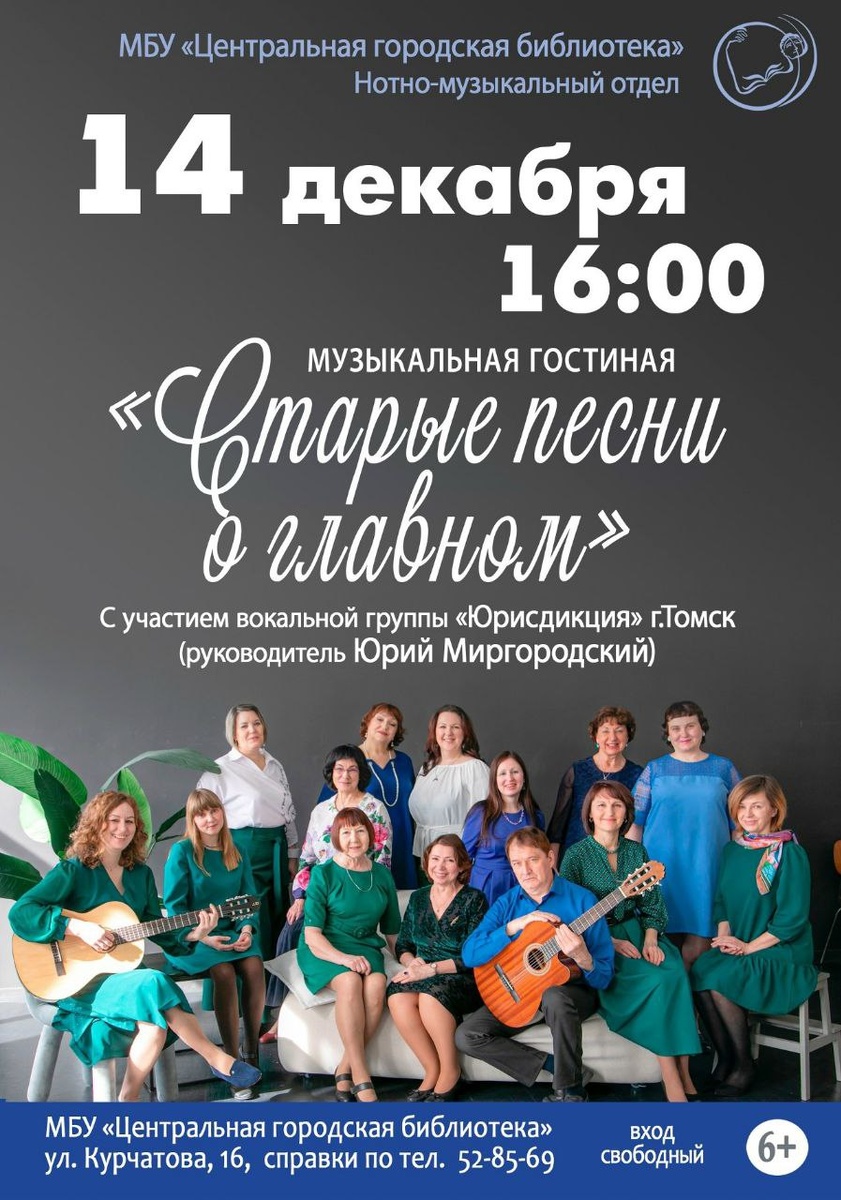 14 декабря в 16:00 северчан приглашают на встречу с группой «Юрисдикция» под руководством Юрия Миргородского Организатор и руководитель творческого объединения «МиргородТомск» Юрий Миргородский – неисчерпаемо творческая личность. В разные годы он создал студию «Акцент», клуб песни «Своя среда» (КПСС), одним из первых поддержал летний уличный фестиваль «Чеховские пятницы». Юрий Алексеевич не только автор-исполнитель, он известный в Томске преподаватель игры на гитаре. Этот подарок мы делаем для северчан в канун Нового года. В багаже «Юрисдикции» опыт различных выступлений, как на квартирниках, так и в концертных залах на городских мероприятиях. Вы услышите старые добрые песни, которые можно назвать золотым фондом нашей эстрады, любимые песни, с которыми связаны только теплые и положительные эмоции. Информацию можно получить по тел. 8(3823)52-85-69 #СеверскАфиша