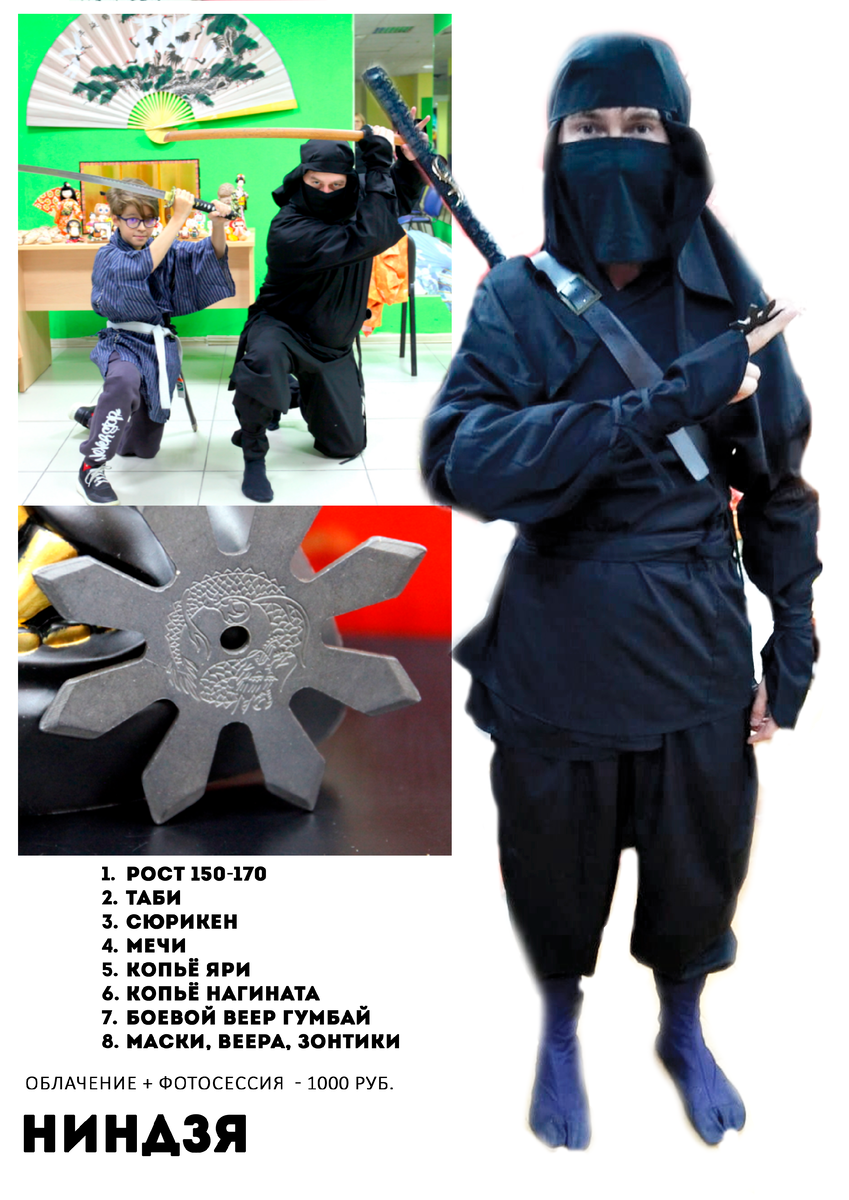 Дорогие друзья! Продолжаем знакомить всех интересующихся с нашими японскими костюмами для фото на память. Как вы знаете, все желающие могут бесплатно сфотографироваться, используя маски, веера, сумочки, шлемы и японское вооружение. А вот сложное облачение и съемки можно сделать за дополнительную плату. Сегодня вы можете посмотреть какие возможности и варианты открываются с костюмом Ниндзя. Доспех рассчитан на рост 160-180 см., подходит подросткам, мальчикам и девочкам, мужчинам и женщинам. В качестве вооружения и аксессуаров мы предлагаем любые мечи из нашего арсенала, копья яри и нагината, боевой веер гумбай, сюрикен. Что получается – смотрите сами. Приглашаем на программу «Японский Новый год». Программа состоит из экскурсии, во время которой мы расскажем о традициях празднования Нового года в Японии, покажем различные ритуальные предметы и куклы, связанные с этим праздником, познакомим вас с японскими новогодними сказками. После экскурсии на мастер-классе мы распишем фарфоровую за
