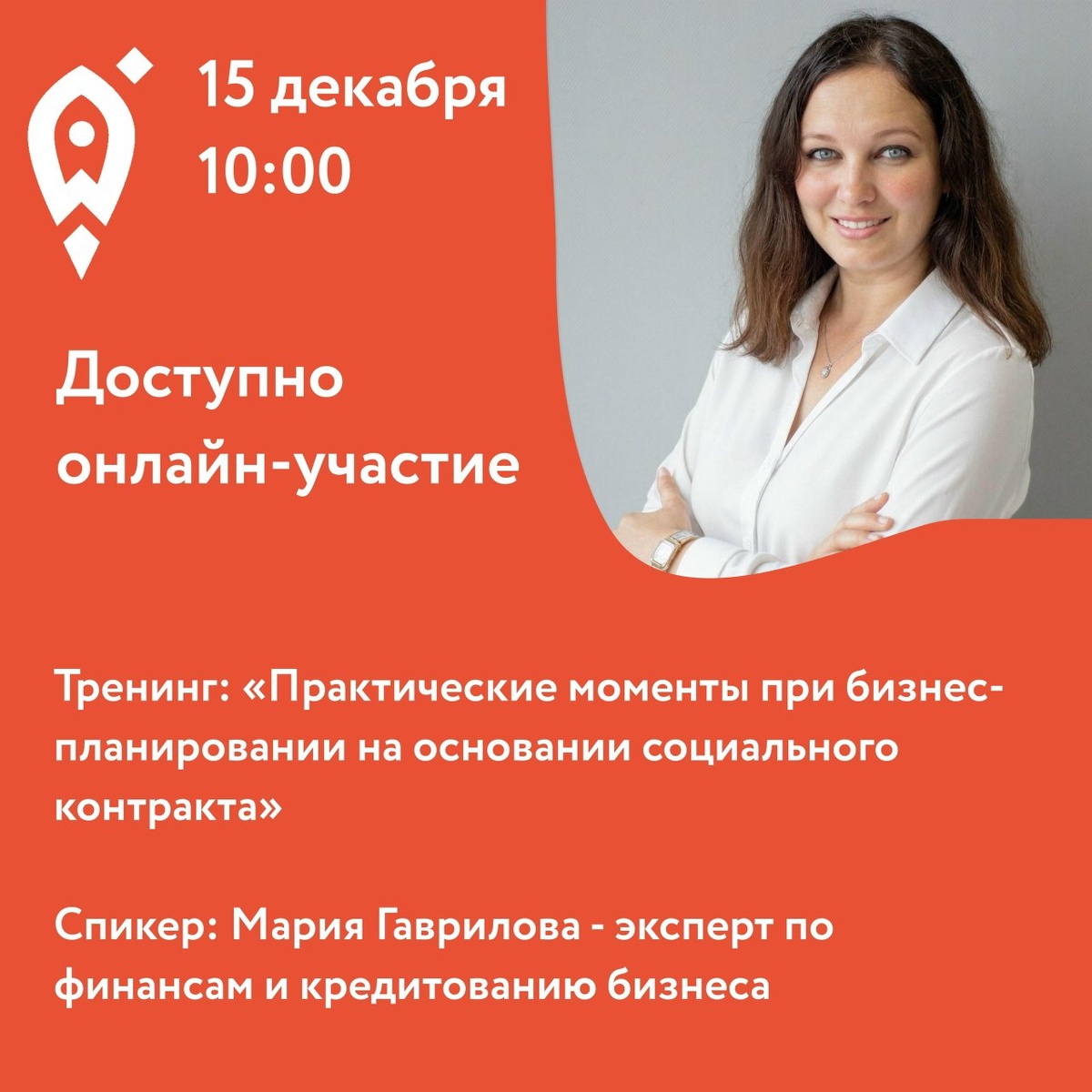 ⏰15 декабря в 10-00ч. в центре «Мой бизнес» пройдет тренинг «Практические моменты при бизнес-планировании на основании социального контракта» 🚀Успей подать заявку на тренинг ⏰15 декабря в 10-00ч. в центре «Мой бизнес» пройдет тренинг «Практические моменты при бизнес-планировании на основании социального контракта» ⌛Формат участия очно или онлайн Регистрация по ссылке: vk.cc/cRYPZB В программе тренинга: ✔Требования по получению поддержки и отчётности в рамках социального контракта. ✔Суть бизнес-планирования. ✔Обзор систем налогообложения. ✔Практические моменты по написанию бизнес-плана по социальному контракту (рассмотрение нескольких направлений). 📍Тренинг проводится для физических лиц и индивидуальных предпринимателей зарегистрированных в Новгородской области. Мероприятие организовано центром «Мой бизнес» при содействии министерства инвестиционной политики Новгородской области в рамках реализации нацпроекта «Эффективная и конкурентная экономика».