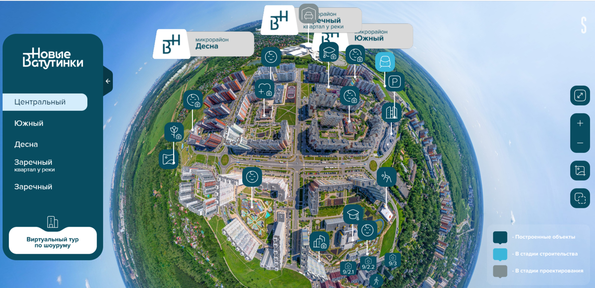 Согласитесь, выбирать квартиру по картинкам в интернете это одно, а увидеть всё своими глазами — совсем другое. Но в современном ритме жизни не всегда удается выкроить несколько часов на поездку, особенно если погода за окном не радует или вы живете в другом городе. Мы решили эту проблему и стерли расстояния. Теперь, чтобы почувствовать атмосферу Новых Ватутинок, вам не нужно никуда ехать. Достаточно просто устроиться поудобнее с чашкой чая и открыть наш новый интерактивный 3D-тур. Это не просто набор фотографий, а полноценное виртуальное путешествие, где вы управляете каждым шагом. Взгляд с высоты птичьего полета Ваше знакомство начнется с впечатляющей панорамы. Вы словно парите над районом, видя его реальный масштаб. Покрутите камеру: вот микрорайон «Центральный» с его широкими проспектами, а вот, чуть поодаль, уютный «Заречный» у самой реки. С такого ракурса очень удобно оценивать окружение. Вы сразу поймете, насколько близко находится лес, где протекает река Десна и как расположе