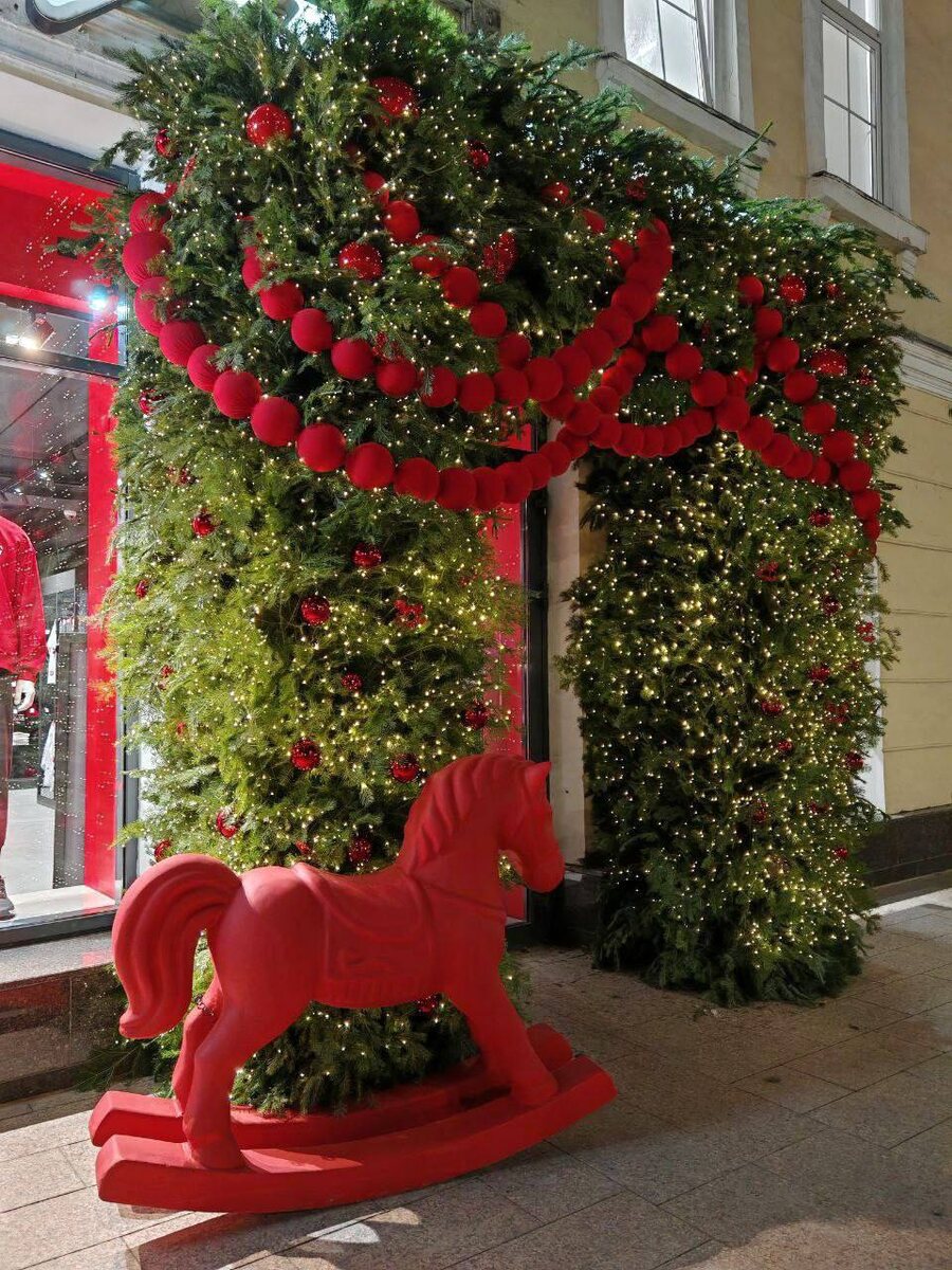 У клиентского центра «Авангард» на ул. Ленина, 20 появилась красная лошадка‑качалка, а вход оформили еловыми ветками и бусами. На крупнейшем катке города у «Красной Звезды» завершили украшение ёлки — теперь там есть фотозона с ярко‑красными косами. Фото: Омск_Путеводитель