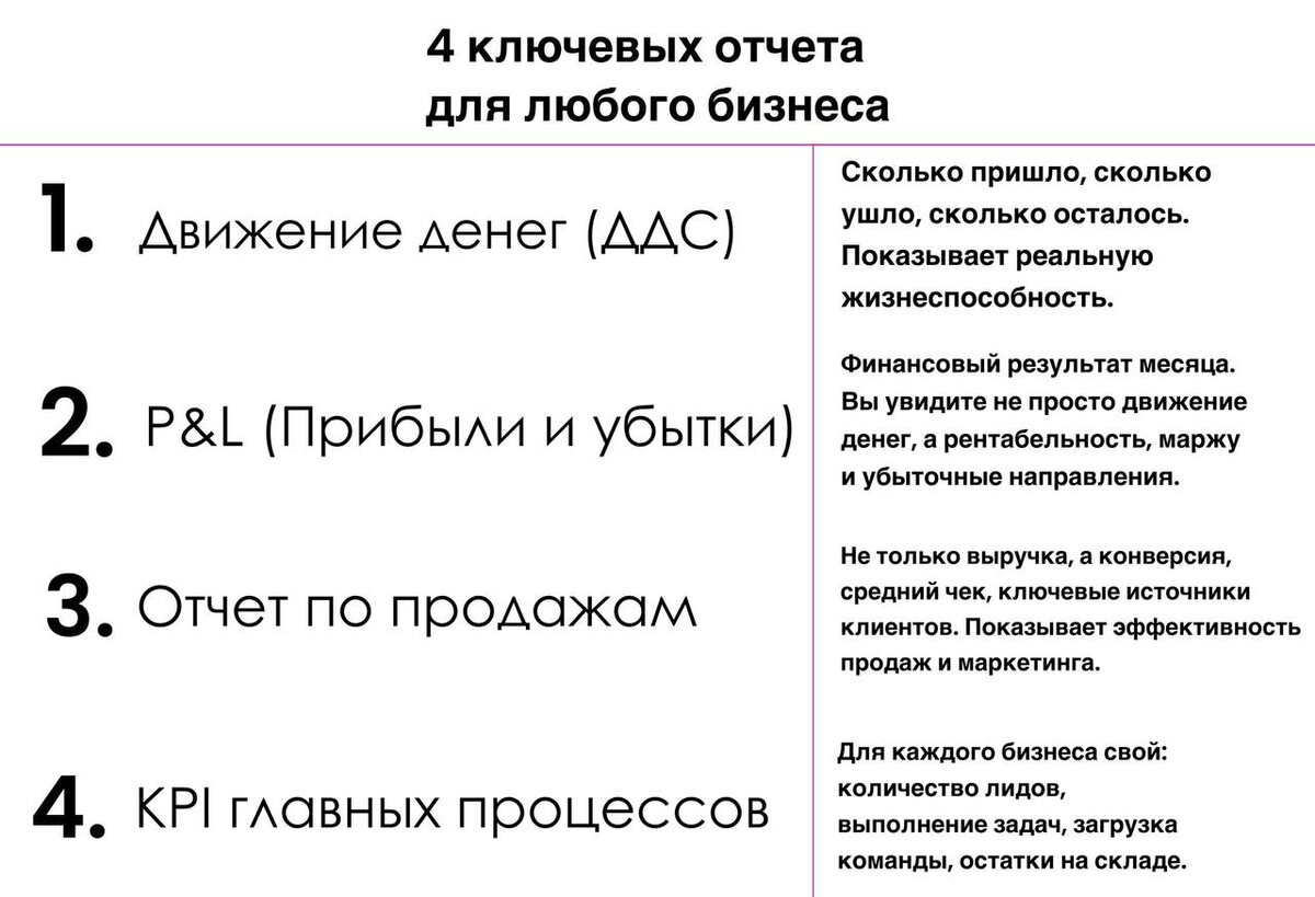 Спойлер: Не нужно строить сложные системы. Начните с 4-х точек фокуса (описала в картинках к посту), и вы превратите бизнес-хаос в ясную картину, на основе которой можно уверенно расти. 4 года назад я плотно втянулась в тему отчетов. Когда мне дали первую продуктовую команду, я, конечно, не совсем понимала, что делать, принимала решения скорее интуитивно. Спустя год плотного взаимодействия с айтишниками, я открыла для себя чудесный мир отчетов обо всем на свете! Хотелось посмотреть абсолютно все: «а сколько мы вот это делаем», «а какой это процент от общей нагрузки», «а как можем контролировать скорость вот этого?». Благо, я достаточно быстро научилась задавать себе вопрос, «а какое решение я хочу принять, когда узнаю, сколько…»? Посчитать можно практически все, но создание любого отчета тоже стоит денег: время на постановку задачи, описание того, что и как хотим видеть время на сбор и структурирование информации и только потом проверка и принятие решения Все это - время + доступ к