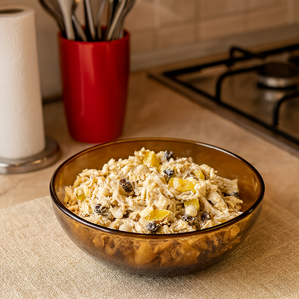 Приветствую, уважаемые гурманы и просто те, кто ищет что-нибудь на праздничный стол! Мы сегодня представляем вам интересный салат, в котором уживаются, казалось бы, несовместимые продукты: курица, чернослив, апельсин и орех. Берем: Куриное филе – 200 г Яйца куриные – 2 шт. Чернослив без косточек – 100 г Апельсин – 150 г Грецкие орехи – 40 г Сыр твердый (например, голландский, гауда) – 60 г Майонез легкий – 60 г Соль по вкусу и желанию. Делаем: 1. Куриное филе варим до готовности в подсоленной воде. Вынимаем, даем остыть. Затем при помощи вилки разбираем филе на волокна. Так салат будет интереснее по текстуре. Отправляем волокна в салатную миску. 2. Яйца варим вкрутую, охлаждаем в ледяной воде, чистим и нарезаем кубиками или трем на крупной терке 3. Если чернослив очень сухой, его можно на 10 минут залить горячей водой. Но обычно достаточно просто хорошо промыть под проточной водой и обсушить бумажным полотенцем. Режем его небольшими кусочками. Добавляем в миску. 4. Очищаем апельсин от