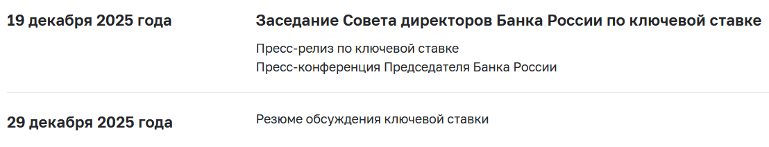 Календарь решений по ключевой ставке Индексы облигаций Индекс Мосбиржи государственных облигаций ценовой RGBI Курс индекса Вся история торгов Цикличность Один довод из множества доводов в ожидании ВДКМВДК (2028-2029 гг.)... Доходность индекса Вся история Напоминаю История прошлого Ещё один довод из множества доводов в ожидании ВДКМВДК через 4 года после начала понижения процентной ставки. Ключевая ставка Ключевая ставка Банка России и инфляция Прогнозы Ожидаемый диапазон ("вилка") Понижение ключевой ставки 4 раз подряд... Если ЦБ РФ гонит (время поджимает) или его "подгоняют", то 19 декабря - снизит ставку. Опять-таки, налогов больше соберёт с долгосрочных банковских депозитов...