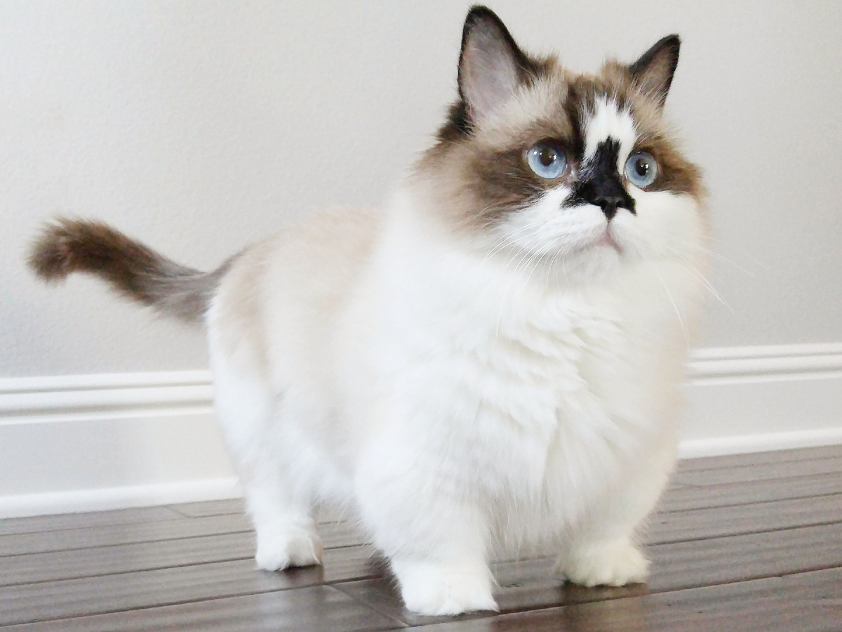 - Лапы: Главная особенность — короткие лапы, которые выглядят так, будто кошка постоянно находится в движении или присела.