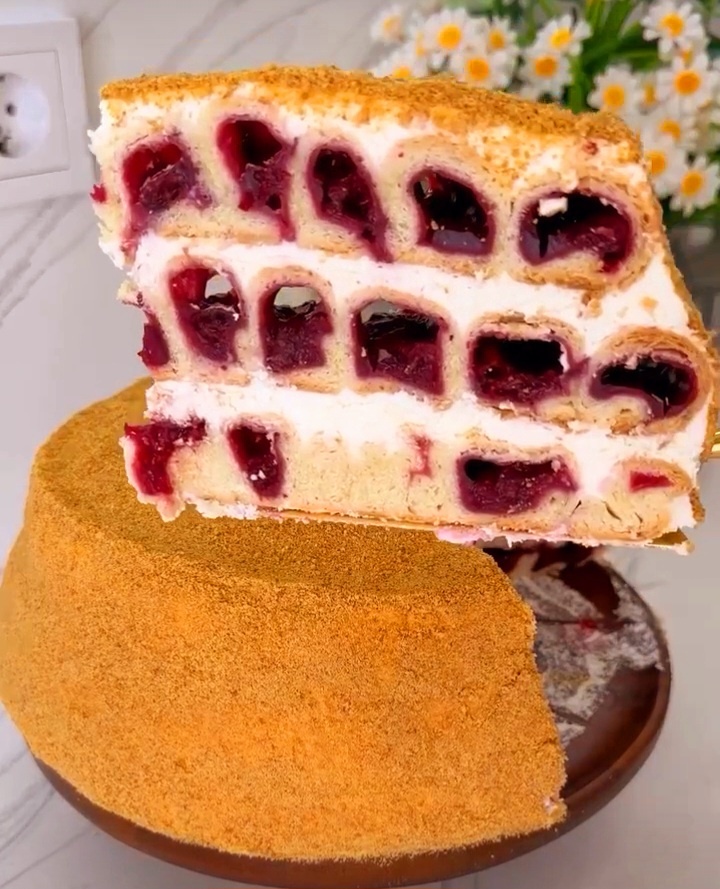 6. Отправьте готовый торт в холодильник минимум на 3 часа для пропитывания и застывания крема.