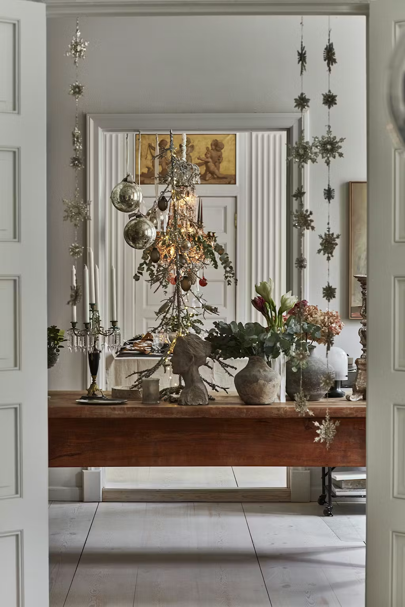 Интерьерный дизайнер Джозефин Сталь каждый год превращает свою квартиру в центре Копенгагена в новое рождественское пространство. Она выросла в творческой семье: ее отец и дед, Руди Олсен и Гудмунд Олсен, были художниками, и любовь к искусству и архитектуре стала частью семейной культуры. Ее просторная классическая квартира с резными дверями и ажурным барельефом в столовой идеально подходит для масштабного праздничного оформления. В этом году антикварная хрустальная люстра в стиле ампир украшена свежими ветками эвкалипта, коричневыми свечами и старинными елочными игрушками, найденными на аукционах. На диване Edra 1990-х годов — новая обивка, а над ним висит работа художницы Пернилле Эгесков. Каждое Рождество у Джозефин — новое. Темой в этот раз стало барочное произведение искусства с темной палитрой и корично-коричневым оттенком — оно определило оформление стола и выбор аксессуаров. Белая керамика из мастерской ее сестры Tout Baroc эффектно контрастирует с глубокими цветами, а серв