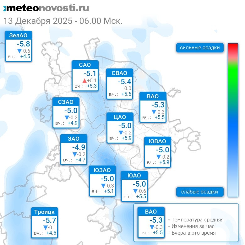 В 6:00 в Москве было от -6.1°C до -4.5°C, средняя температура -5.2°C #погода #Москва #зима #температура #13декабря #суббота