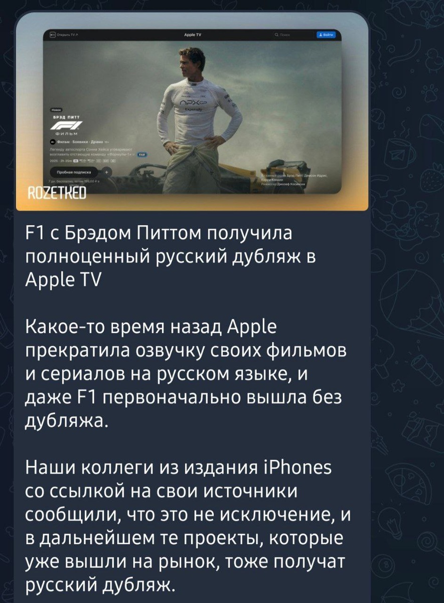 F1 с Бредом Питтом получила полноценный русский дубляж. В Apple TV перестали появляться фильмы с русским дубляжем, но это похоже меняется. Пишут что Apple планирует добавить русскую озвучку даже на уже выпущенные релизы. Подпишись 👇 Всё об умном доме https://dzen.ru/id/5f2a2d42182c181bad97af84 Самый полезный Техно-Чат без флуда https://t.me/SmartHomeForum Эксклюзивный контент на Boosty https://boosty.to/k_shvedov Rutube https://rutube.ru/channel/23591933 Дзен https://zen.yandex.ru/Shvedov