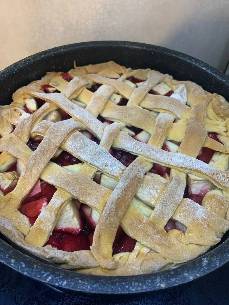 Пока ждем когда лед станет, приготовим пирог с брусникой и яблоками: 😋🎣🐟🐟🐟 Ингредиенты: ✅ Яйцо — 1 шт. ✅ Сахарный песок — 230 г ✅ Масло сливочное — 100 г ✅ Сода — 0,25 ч. л. ✅ Мука — 200 г ✅ Вода — 50 мл ✅ Брусника — 200 г ✅ Яблоки — 1 кг ✅ Крахмал — 2 ст. л. ✅ Мёд и лимонный сок — по вкусу ГОТОВИМ 😋😋😋 ✅Нарезаем масло кусочками, ТУДА ЖЕЖ яйцо, соду и 100 г сахара. ✅ Добавляем просеянную муку и замешиваем тесто💪 ✅ Тесто в форму, разровняли по дну и бортикам, отправили в холодильник на 30–40 минут. ✅ Яблоки нарезали и смешали с брусникой. ✅ Смешали крахмал с водой, влили в кастрюлю с яблоками и брусникой, готовим 5–10 минут. ✅ Выложили начинку в форму, сверху ломтики оставшихся яблок, сбрызнутых лимонным соком. ✅ В духовку на 180 °C 30–40 минут. ГОТОВЧЕНКО❗️❗️❗️😋😋😋😋😋😋😋😋😋😋😋😋😋😋😋😋 P.S. Дело рук супруги 😘👆 #рецепты #рецептпирог #пирогсяблоком #пирогсбрусникой