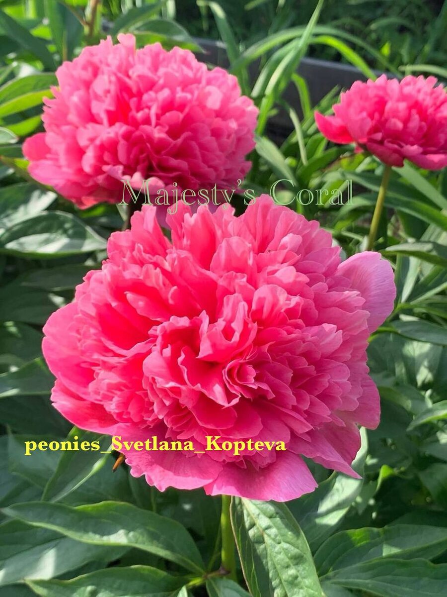 ЗНАКОМСТВО С СОРТОМ. Пион Majesty’s Coral ( Roger F. Anderson / Swenson Gardens , 2022 год ) В момент открытия цвет темный кораллово-лососевый , тускнеет по мере созревания, переходит в коралл и, наконец, в слоновую кость. Защитные лепестки округлые, зазубренные в центре, чашевидные, шириной около 1½ дюйма. Внутренние лепестки более мелкие, зубчатые. Кольцо из ремешкообразных лепестков разделяет внутренний и внешний лепестки. Тычинки отсутствуют. В среднем 4 плодолистика, зеленые, слабо волосистые. Рыльца розовые, с нормальной анатомией. Ранняя листва зеленая. Вертикальный рост до 38 дюймов (96 см), поддержка не требуется.