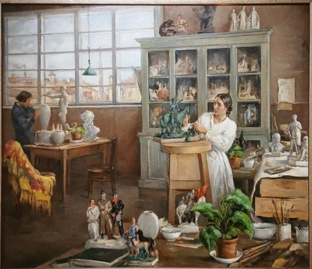 А в Москве завершилась выставка «Соцреализм. Стиль большой эпохи». Это одна из экспонируемых картин. Называется «Скульптурная лаборатория Ломоносовского завода» — написанная в 1936–1937 годах Марией Львовной Тиховой-Финкельштейн. В центре комнаты около станка стоит темноволосая женщина в белом халате, которая лепит всадника, - это художница-керамистка Наталия Яковлевна Данько. Видели медальоны на «Театральной», - её рук дело, - об этом рассказывал Валерий Леонов на экскурсии «Как мы строили метро. Тридцатые. Вторая очередь». Неужели вторая женщина, - художник, - сестра Наталии Яковлевны, - Елена Яковлевна? Не разобрать, - но, учитывая, что они любили работать вместе, - очень и очень вероятно.
