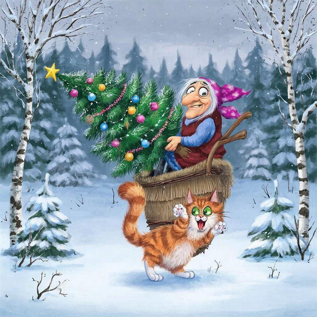 — В путь-дорогу Баба-Яга собралась быстро. Всего-то дел, ступу в избу завести, чтобы нагрелась. Казалось бы, прыгай и лети, но Баба-Яга медлила и всё находила себе дела. Перво-наперво она приготовила тушёного зайца, чтобы вкусный аромат поспособствовал усилению магии зова дома. Кроме того, ей хотелось отпраздновать и Новый год именно так, как это делали люди, и возвращение блудного Кота справить, потому-то и заморочилась бабка угощением. Затем она тщательно подмела избу и даже повесила на окна свежие занавески (занавески Баба-Яга стирать не любила, поэтому, когда на них появлялся серый, пыльный налёт, она их просто снимала и укладывала в сундук, а через полгода вынимала и называла чистыми). Проверила, хорошо ли увязаны прутья метлы и на месте ли тёплая подстилка в ступе. Зачем-то сходила к медвежьей берлоге и прислушалась к храпу семейства Топтыгиных. Слегка поругалась с волками и пожаловалась на них Водяному. В общем, тянула время как могла. Почему? Неужели трусила древняя бабка? Ещё как! Поэтому и не спешила залезать в ступу, всё находила себе дела. Но, наконец-то, все отговорки были исчерпаны, морозы крепчали, и однажды утром баба-Яга поняла: время настало! Если сегодня она не выполнит задуманное, вся её жизнь пойдёт прахом! Это жуткое предчувствие придало Бабе-Яге сил и решимости. Кряхтя, она влезла в ступу, молодецки свистнула и полетела к огромному городу, свернувшемуся на краю тёмного леса хищным зверем. Где искать самую красивую ёлку? Как её украсть? Об этом Баба-Яга не думала, справедливо полагая, что чутьё и везение приведут её в нужное место. И она не ошиблась. На самом краю города стоял острый, высоченный дом. Он высился на незримой границе, очерченной Бабой-Ягой, как одинокий зуб в старой волчьей пасти, и выглядел неестественно и странно, особенно в свете разгорающегося дня. Ни секунды не сомневаясь, Баба-Яга подлетела к окнам последнего этажа и в первом же увидела самую прекрасную картину на свете — наряженную ёлку. Она была невероятно красива, и Баба-Яга даже на минуту перестала дышать, боясь спугнуть этот непрочный, неземной морок (на самом же деле ёлка была довольно уныла, страшна и стара; пластиковые ветки выцвели, игрушки утратили блеск и растеряли позолоту, а огоньки гирлянды мигали лишь тогда, когда им самим этого хотелось, то есть примерно раз в сутки, но Баба-Яга увидела совсем другое, ведь ей не с чем было сравнивать, а рассказы Кота были расплывчаты и не ясны). «Она даже прекраснее, чем я себе представляла!» — ахнула Баба-Яга, приложила к окну особый корешок, открывающий любые запоры, распахнула створки, влетела в комнату, быстро сграбастала ёлку и была такова! «Быстрее, быстрее, быстрее!» — вопила Баба-Яга, подгоняя ступу! «Домой, скорее домой!» Ах, как же Бабе-Яге было страшно! Ей казалось, что погоня её уже настигает, что вот сейчас неведомые силы заберут это сокровище — прекрасную, необычную ёлку! А вместе с ней и исчезнет надежда на возвращение Кота. Баба-Яга, боясь оглянуться, с удивлением почувствовала, как ей не хватало приключения, хотя бы вот такого, простенького! И на самую крошечную долю секунды она вдруг пожелала, чтобы прямо сейчас её ступу настигал разгневанный владелец прекрасного новогоднего чуда, чтобы ёлку нужно было отстаивать в жестоком споре и даже драке. С кем? Какая разница! Нет, нет, нет! Тут же опомнилась