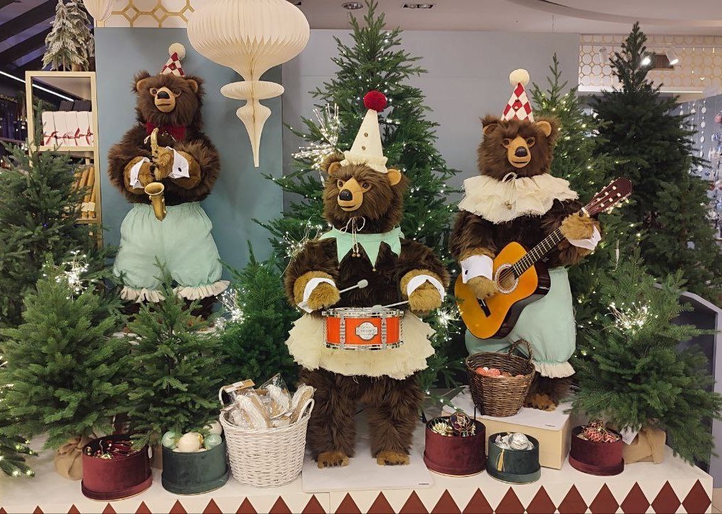 В самом сердце новогоднего пространства дает музыкальный концерт великолепное трио артистичных медведей