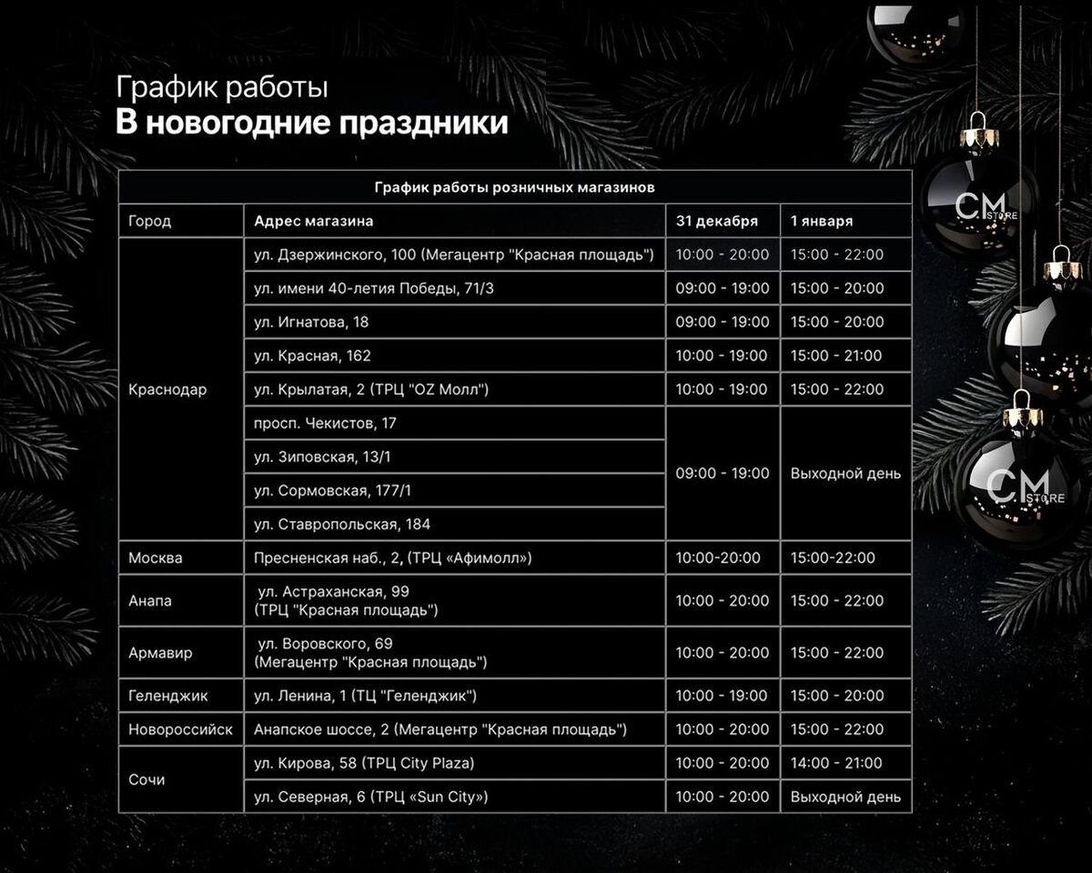 : 31 декабря и 1 января график работы сокращён, в остальные дни работаем в обычном режиме. Подробный график работы прикрепляем 👆 🛒 График работы интернет-магазина: • 31 декабря — 09:00–20:00 • 1 января — 14:00–22:00 Всех с наступающим Новым Годом! 🎉