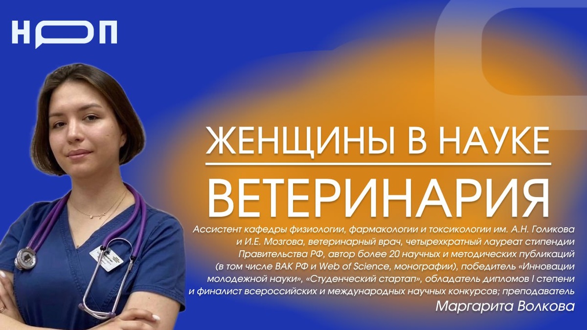 Что объединяет исследования в области физиологии животных, практическую работу с питомцами и запуск собственного стартапа на стыке науки и бизнеса❓ ➡️ Маргарита Волкова – ассистент кафедры физиологии, фармакологии и токсикологии им. А.Н. Голикова и И.Е. Мозгова, ветеринарный врач, четырехкратный лауреат стипендии Правительства РФ, финалист международных конкурсов, рассказала НОП, как пришла к выбору профессии, нашла баланс между наукой, преподаванием и бизнесом, и почему считает женское участие в ветеринарии потенциалом для развития всей отрасли. 💬Как возник интерес к физиологии и ветеринарии? К выбору своей профессии пришла неожиданно. Смотря на свою семью, хотела связать свою жизнь с химией. Еще я много лет занималась конным спортом и вообще очень люблю животных. В один прекрасный день пришла идея, что ветеринария - это интересный компромисс. Потом, уже обучаясь на факультете ветеринарной медицины, поступила на параллельное обучение на зоотехника - чувствовала потребность. На трет