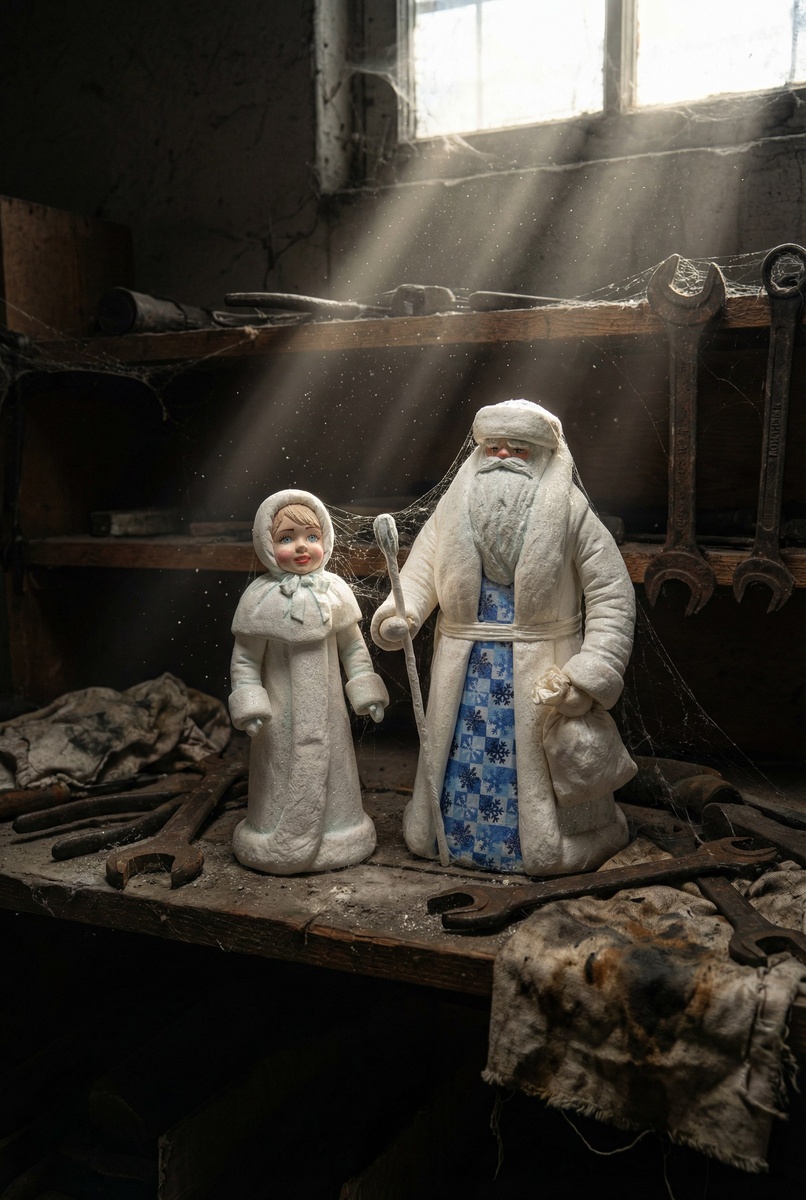В моем новом ролике старые советские фигурки Деда Мороза и Снегурочки, забытые в темном гараже, снова становятся центром праздника.