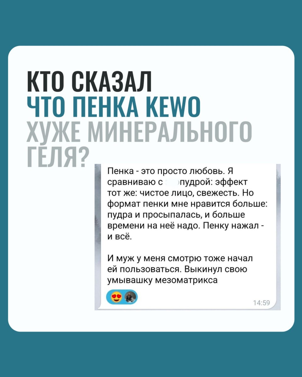 ? ❄️Я увидела, что привычки мешают некоторым моим клиенткам познакомиться с Кево. Что ж, в этом во многом моя ответственность. Я часто писала о достоинствах продуктов, которые выбрала в свой бутик, и редко о недостатках. Но знаете, что? Все это время я искала лучшее решение. И теперь оно есть - пенка которая очищает также хорошо, но не пересушивает, и при этом у нее комфортный формат без твердых частиц и этапов "добавь воды" или "потряси". Посмотрите, что пишет Маша: 💬 "Пенка - это просто любовь. Я сравниваю с ***пудрой: эффект тот же: чистое лицо, свежесть. Но формат пенки мне нравится больше: пудра и просыпалась, и больше времени на неё надо. Пенку нажал - и всё. И муж у меня смотрю тоже начал ей пользоваться. Выкинул свою умывашку мезоматрикса" Я согласна с Машей, пока не попробуешь, не поймешь разницу. Кажется, ну пенка и пенка. Если у вас, как у меня, всегда был негативный опыт с гелями и пенками, то я вас особенно понимаю. Мне все пенки сушили и доставляли дискомфорт. 💦