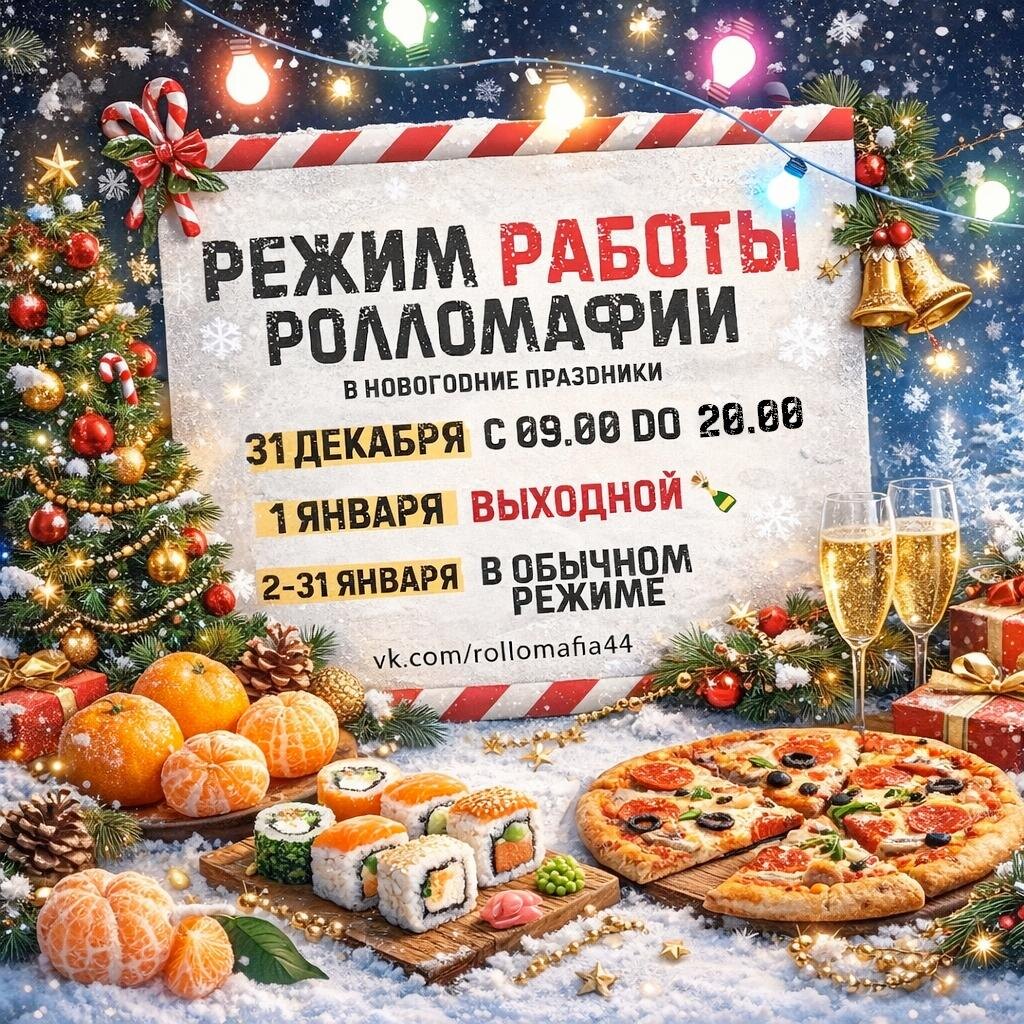 🥰 30 декабря Ролломафия работает в обычном режиме. 31 декабря – с 09:00 до 20:00. 1 января Ролломафия отдыхает. А уже со второго января Ролломафия вновь работает для вас в стандартном режиме! 🎩 С наступающим Новым 2026 Годом! 🎄 ЗАКАЗАТЬ ЛУЧШИЕ РОЛЛЫ, ВОКИ, ПИЦЦУ В ГОРОДЕ 👇 🛒 Через сайт: rollomafia.ru 📱 По телефону: +79101911488 ✉ Через сообщения: vk.me/rollomafia44 Приложение на IOS: vk.cc/coZKII 🤖 Приложение на Android: vk.cc/cpmcSVс