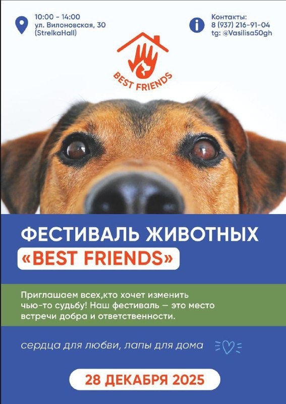 Посетите добрый фестиваль «Best Friends» и подарите дом пушистым друзьям из приютов «Флагманвет» и «Кот-бегемот». Вас ждет встреча с кошками и собаками, мечтающими о семье, а также яркая детская программа с мини-квестом, фото-зоной и играми. Приносите корма и лекарства, чтобы помочь тем, кто еще ждет. 📅 28 декабря (воскресенье) в 11:00–14:00 📍 StrelkaHall, ул. Вилоновская, 30 Вход свободный #фестивали #длядетей #навыходных 👉 куда ещё сходить в Самаре