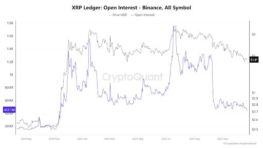 %? 📉 Открытый интерес XRP на Binance снизился до $453 млн, что является самым низким показателем с конца прошлого года. Это может быть 📈 бычьим сигналом, поскольку низкий открытый интерес часто предшествует крупным ралли, как это было ранее, когда XRP вырос на 600%. Снижение спекулятивной активности создает более здоровую рыночную среду, ориентированную на спотовый спрос. 📊 Ключевые моменты: - Открытый интерес XRP снизился до $453 млн. - Снижение указывает на выход краткосрочных спекулянтов и уменьшение использования кредитного плеча. - Исторически, периоды низкого открытого интереса предшествовали значительным ценовым ралли. - Аналитики предполагают возможное формирование нового высокого минимума, с потенциалом прорыва выше $2 и достижения $4.5 в первой половине следующего года. - Текущая цена XRP: $1.84.