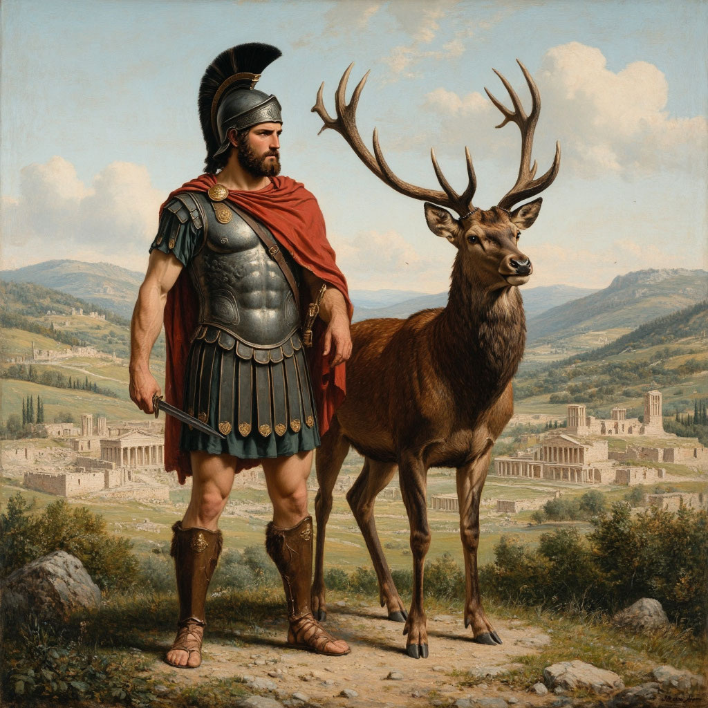 Царь Эврисфей приказал Гераклу живой доставить в Микены чудесную Керинейскую лань. Это создание, посланное богиней Артемидой в наказание людям, опустошало поля Аркадии. Отличительные черты лани: Геракл преследовал лань целый год. Путь пролегал через: Преследование увело героя далеко на север — к стране гипербореев и истокам Истра (современный Дунай). Там лань ненадолго остановилась, но, едва Геракл попытался схватить её, вновь устремилась на юг. Даже после годовой погони лань не утратила сил. Отчаявшись поймать её живой, Геракл прибег к луку: Ранил лань стрелой в ногу — только тогда смог настигнуть. Взвалил добычу на плечи, готовясь нести в Микены. На пути героя встала разгневанная Артемида — покровительница лани. Богиня вопросила: «Разве не знал ты, Геракл, что лань эта моя? Зачем оскорбил ты меня, ранив мою любимую лань? Разве не знаешь, что не прощаю я обиды?» Геракл смиренно ответил, объяснив, что действовал по приказу Эврисфея, а не по собственной воле. Он подчеркнул: Артемида п