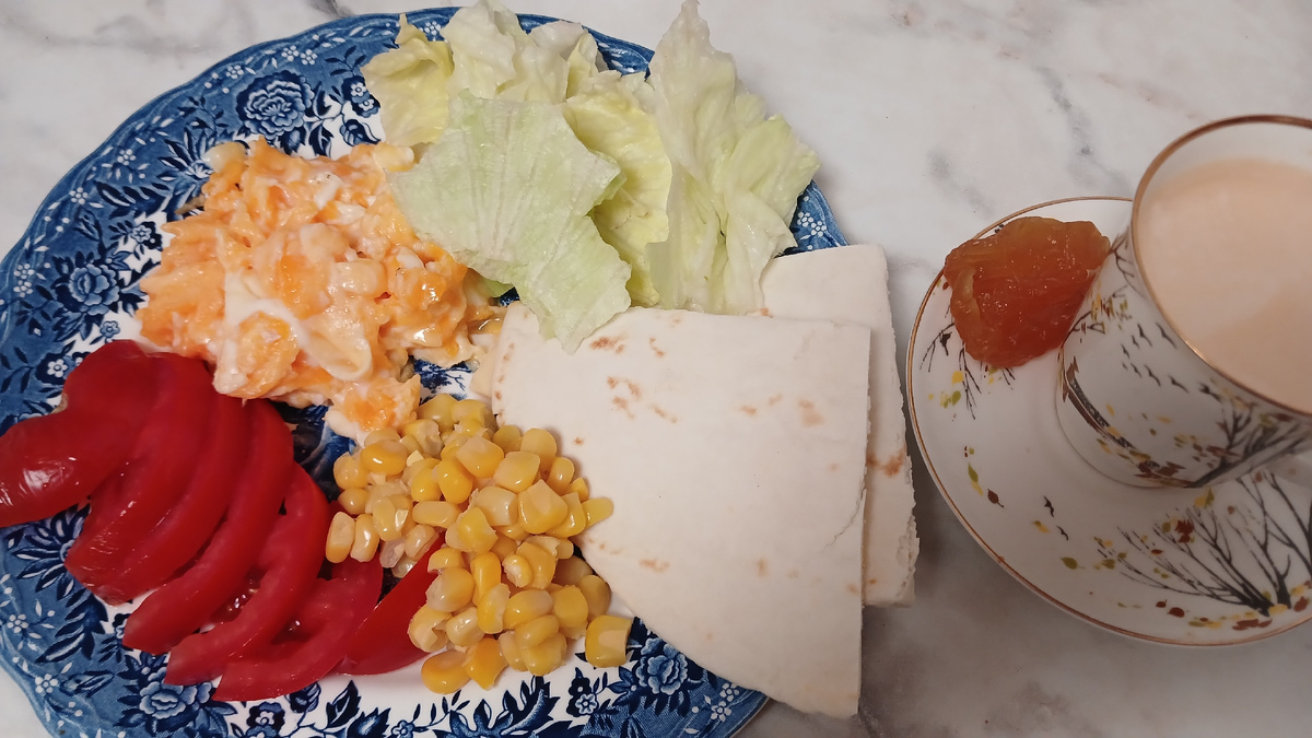 В декабре мы питаемся на сумму меньше, чем прожиточный минимум, это 288 руб в день на человека. Это 85% от суммы ПМ Завтрак собрала из того, что было в холодильнике. Приготовила скрэмбл, лепешка-тортилья с печеночным паштетом и с сыром Маасдам, айсберг, помидоры и кукуруза. Чашка эспрессо с сушеным персиком Обед такой же, как вчера: суп-пюре куриный с рисом и квашеная капуста На десерт фрукты - хурма и мандарин, кофе и конфеты Рафаэлло Ужинали теплым салатом с киноа и мидиями Меню год назад