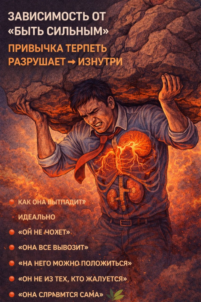 🪨 Есть зависимость, которую у нас принято уважать. Её не лечат. Её хвалят. Её ставят в пример. Это зависимость от быть сильным. Как она выглядит со стороны? Идеально. — «Он не ноет» — «Она всё вывозит» — «На него можно положиться» — «Он не из тех, кто жалуется» — «Она справится сама» Такого человека редко жалеют. Потому что он сам давно перестал жалеть себя. Что происходит внутри? Внутри — хроническое напряжение. Запрет на слабость. Запрет на просьбы. Запрет на «мне тяжело». Человек живёт с ощущением, что если он расслабится — всё рухнет. Он — последний опорный столб. И это не ответственность. Это зависимость от контроля и терпения. Почему она формируется? 🧠 Почти всегда — из раннего опыта. Когда: • некому было помочь • быть слабым было опасно • поддержку нужно было заслужить • эмоции игнорировали • «держись» заменяло заботу Мозг делает вывод: «Выживает тот, кто не чувствует». И человек учится жить, стискивая зубы. Самая неприятная правда ⚠️ Такая зависимость разрушает неза