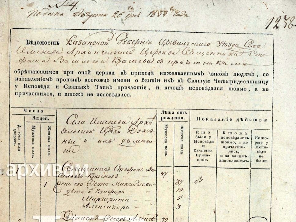 ГИА Чувашской Республики (ГИА ЧР), фонд № 225, опись № 7, дело № 41, стр. 1236 скан. Подана августа 26 дня 1833 года. Ведомость Казанской Губернии Цывильского уезда села Именева Архангельской церкви священника Стефана Васильева Краснова с причетниками обретающимся при оной церкви в приходе нижеявленных чинов людям со изъявлением против коегождо имяни о бытии их в Святую Четыредесятницу у Исповеди и Святого Причастия, и кто ж исповедался токмо, а не причастился, и кто не исповедался. Села Именева Архангельской церкви Духовные и их домашние. 1. Священник Стефан Васильев Краснов. 47 лет. Жена его Феона Михайлова. 37. Дети их: Глафира. 19. Маргарита. 5. Александра. 3. https://yandex.ru/archive/catalog/7f92182b-b35e-4fe8-a63e-8ca329faddd9/1236