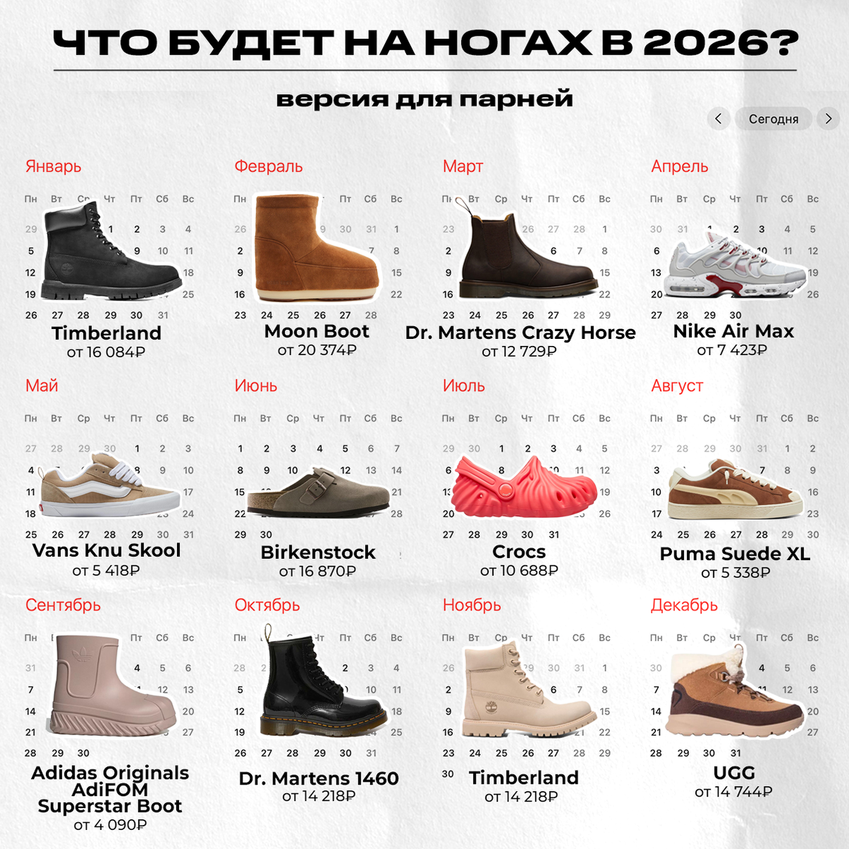 Составили список пар на каждый месяц, чтобы всегда было в чем ходить. И больше никакой головной боли — такие мы заботливые. Январь: Timberland, цена от 16 084₽* Февраль: Moon Boot, цена от 20 374₽* Март: Dr. Martens Crazy Horse, цена от 12 729₽* Апрель: Nike Air Max, цена от 7 423₽* Май: Vans Knu Skool, цена от 5 418₽* Июнь: Birkenstock, цена от 16 870₽* Июль: Crocs, цена от 10 688₽* Август: Puma Suede XL, цена от 5 338₽* Сентябрь: Adidas Originals AdiFOM Superstar Boot, цена от 4 090₽* Октябрь: Dr. Martens 1460, цена от 5 497₽* Ноябрь: Timberland, цена от 14 218₽* Декабрь: UGG, цена от 14 744₽* *стоимость может изменяться в зависимости от курса и размера Больше интересного на нашем сайте POIZON