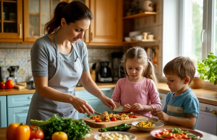 — Я уже почти справилась. Осталось заправить салат и пюрешку сделать.