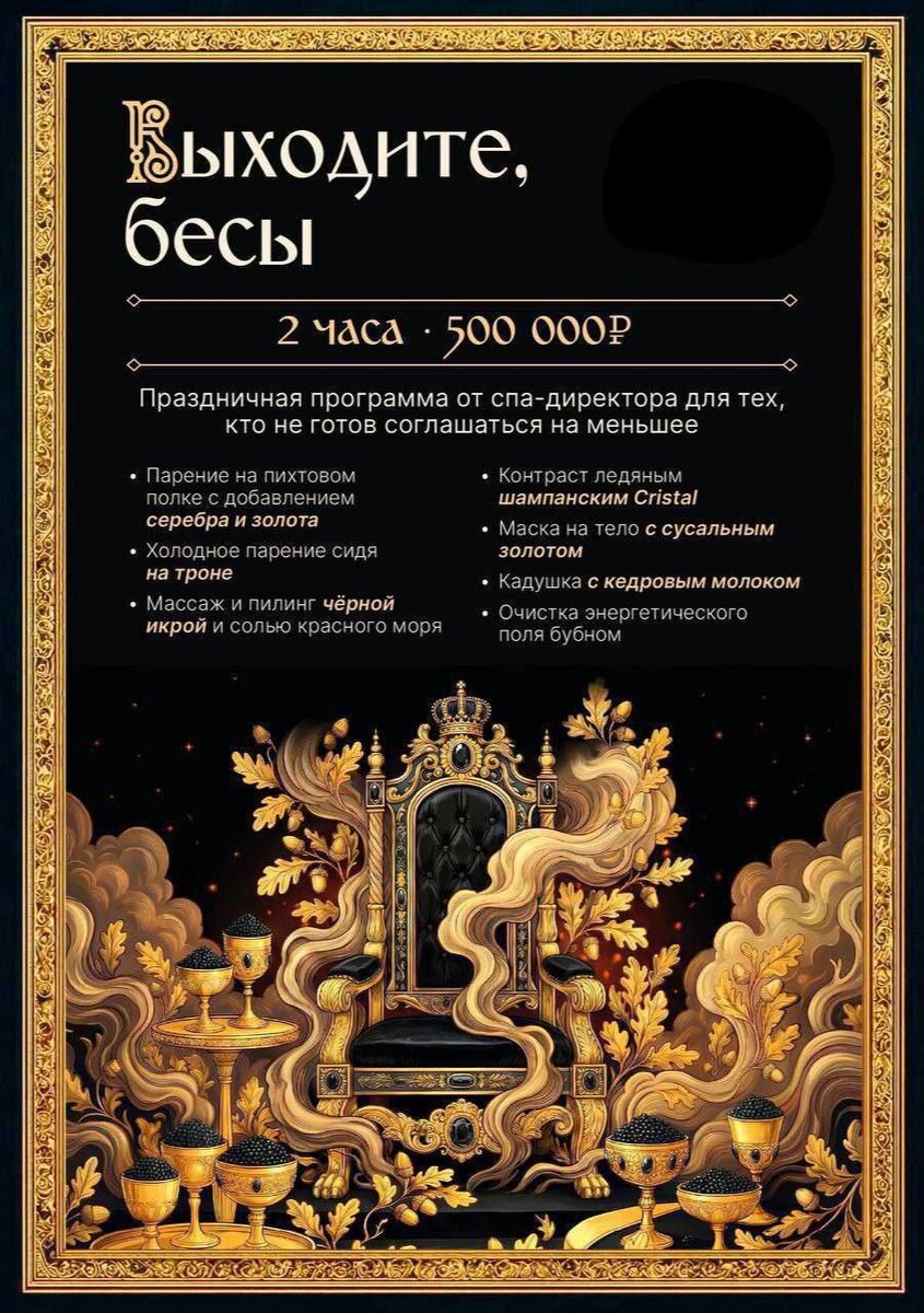 ? Изгнание бесов за 500 тысяч рублей предлагают в московской бане. В спа-экзорцизм входят массаж с чёрной икрой, контрастный душ шампанским Crystal, парение с серебром и золотом, а также пилинг. Это больше на какое-то бальзамирование похоже, чем на парение. Но, говорят, что на ближайшие дни все расписано: «давайте уже после нового года»🤪 Я иногда посещаю общественную баню, в Краснодаре это «Три богатыря». Именно их мастера показали мне, что в бане можно не просто потеть, а реально перезагрузиться. Только после ледяной купели с контрастным проливом, я понял, что русская баня - это крутое СПА!