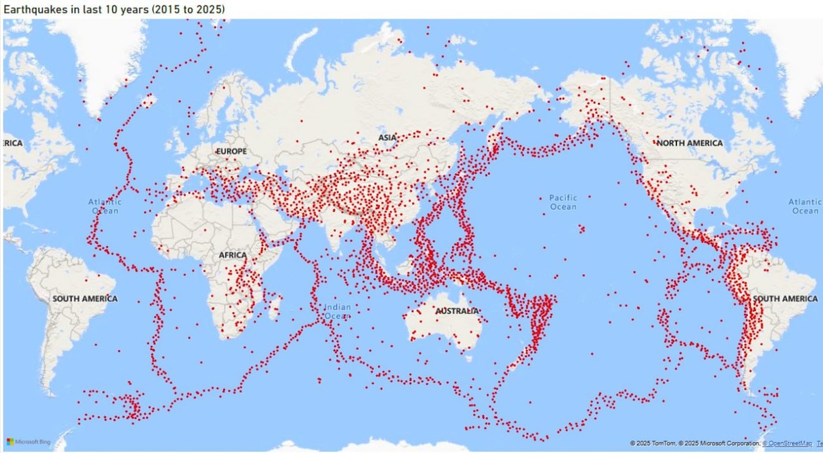 Карта землетрясений за 2015–2025 годы выглядит как сплошное мерцание — тысячи толчков по всей планете